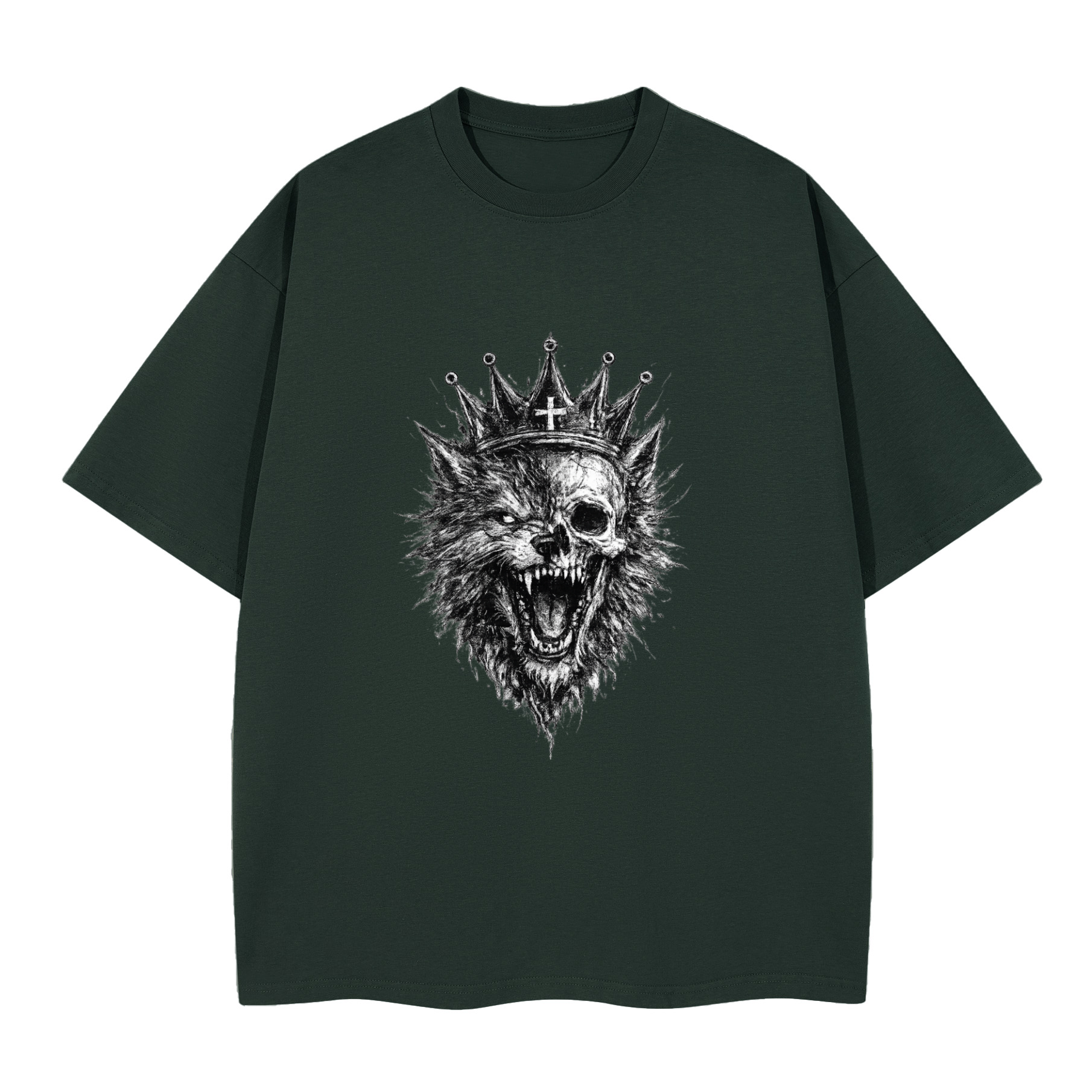 Wolf and skull front graphic and brand quote on the rear of our elevated tee.